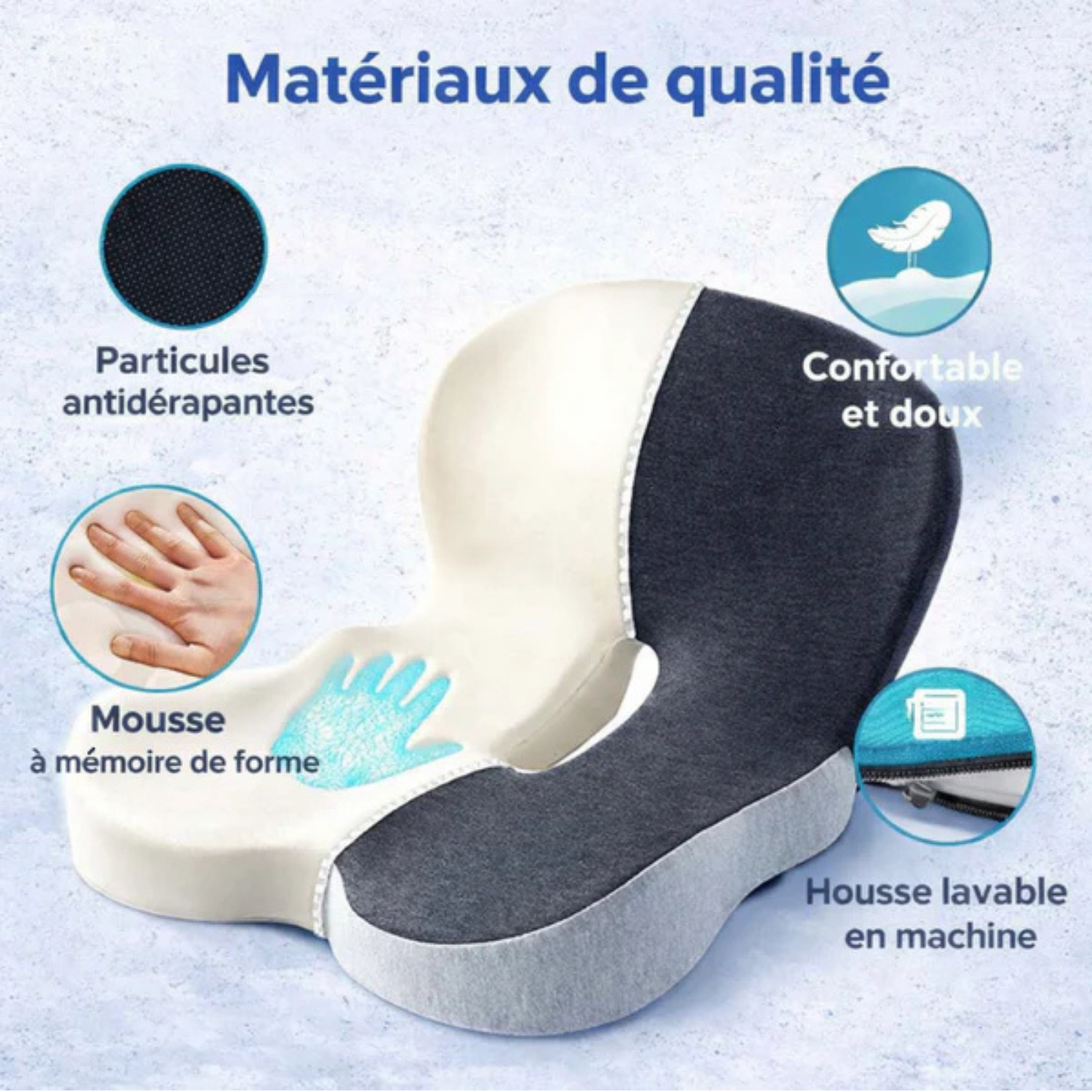 Coussin ergonomique conçu pour améliorer la posture et offrir un confort optimal en position assise, au bureau, en voiture ou à la maison.