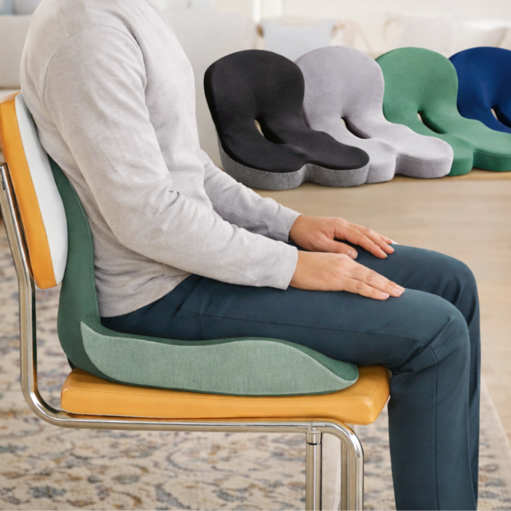 Le Coussin Ergonomique Lafia™ intègre une zone anti-pression du coccyx, un support dorsal stabilisant et une assise élargie pour réduire les tensions, prévenir la compression nerveuse et maintenir une posture saine pendant de longues heures.